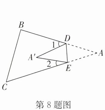8. (2024·鼓楼区期中)如图,将△ABC 纸片沿 DE 折叠,使点 A 落在四边形 BCED 内点 A'的位置,∠A = 35°,则∠1 + ∠2 的度数是