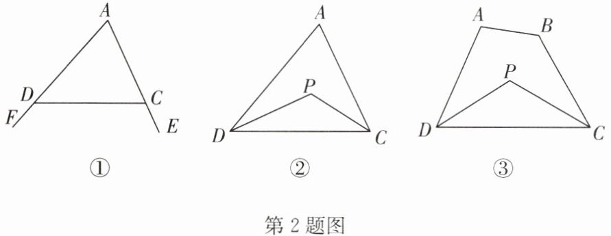 2. (1)如图①,$∠ FDC$与$∠ ECD$分别为$△ ADC$的两个外角,试探究$∠ A$与$∠ FDC+∠ ECD$的数量关系;