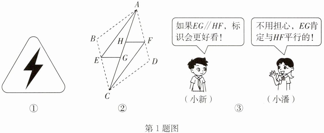 1. 如图①是“小心有电”警示牌,班级数学兴趣小组想要制作图中的闪电标识,如图②,他们先在纸上画一条线段 $ AB $,利用三角尺和直尺将 $ AB $ 平移,得到线段 $ DC $,连接 $ AD $,$ BC $,裁出四边形 $ ABCD $,连接 $ AC $,在 $ BC $,$ AD $ 上取点 $ E $,$ F $,将 $ △ ABE $,$ △ CDF $ 分别沿 $ AE $,$ CF $ 折叠,得到 $ △ AGE $,$ △ CHF $,点 $ G $,$ H $ 均在 $ AC $ 上,则有 $ ∠ AGE = ∠ B $,$ AG = AB $,$ ∠ CHF = ∠ D $,$ CH = CD $。