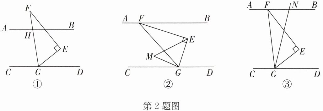2. 在综合与实践课上,老师让同学们以“三角尺与平行线”为主题开展数学活动。已知直线 $ AB $,$ CD $,直角三角尺 $ EFG $,$ AB // CD $,$ ∠ FEG = 90^{\circ} $,$ ∠ EGF = 60^{\circ} $。