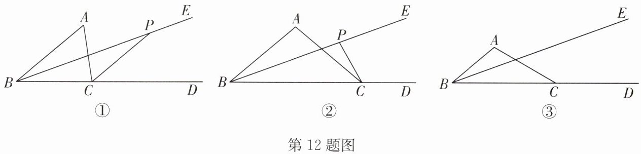 12. (20 分)在 $ △ ABC $ 中,$ BE $ 平分 $ ∠ ABC $,点 $ P $ 在射线 $ BE $ 上.