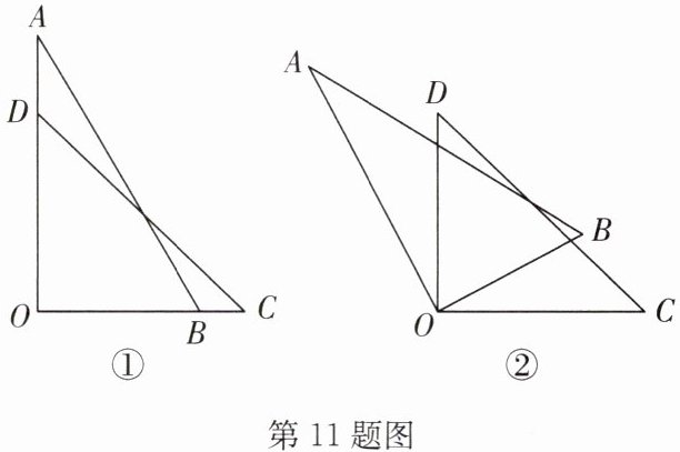 11. (2024·海门区开学)如图①,一副三角尺的两个直角重叠在一起,$∠ A = 30^{\circ}$,$∠ C = 45^{\circ}$,$△ COD$固定不动,$△ AOB$绕着点$O$按逆时针方向旋转$α^{\circ}(0 < α < 180)$.
