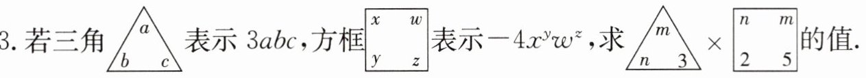 13. 若三角表示$3abc$,方框表示$-4x^{y}wz^{z}$,求×的值.