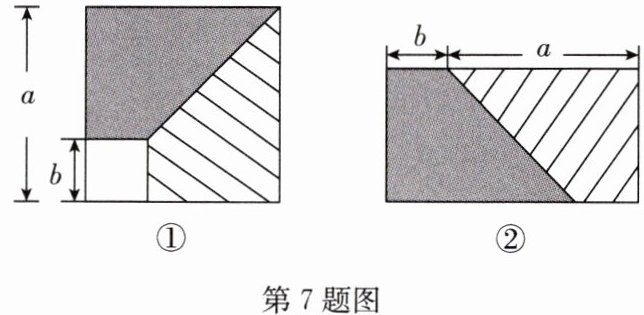7. 从边长为$a$的正方形内去掉一个边长为$b$的小正方形(如图①),然后将剩余部分剪拼成一个长方形(如图②),上述操作能验证的等式是(