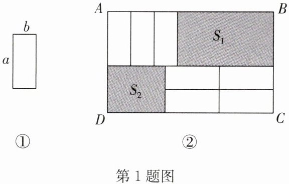 (3) 有 7 张如图①的小长方形,长为 $a$,宽为 $b$,按照图②方式不重叠地放在大长方形 $ABCD$ 内,大长方形中未被覆盖的两个部分(图中阴影部分),设右上角的面积为 $S_1$,左下角的面积为 $S_2$,当 $AB$ 的长变化时,若 $S_1 - S_2$ 的值始终保持不变,求 $a$ 与 $b$ 的等量关系。