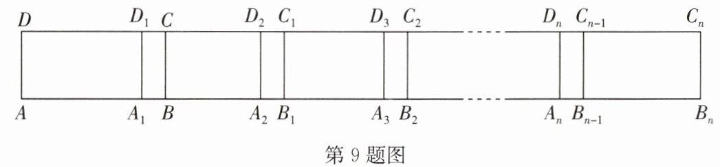 9. (2024·无锡期中)如图,在长方形$ABCD$中,$AB=5$,第$1$次平移将长方形$ABCD$沿$AB$的方向向右平移$4$个单位长度,得到长方形$A_1B_1C_1D_1$,第$2$次平移将长方形$A_1B_1C_1D_1$沿$A_1B_1$的方向向右平移$4$个单位长度,得到长方形$A_2B_2C_2D_2$,$···$,第$n$次平移将长方形$A_{n - 1}B_{n - 1}C_{n - 1}D_{n - 1}$沿$A_{n - 1}B_{n - 1}$的方向向右平移$4$个单位长度,得到长方形$A_nB_nC_nD_n(n>2)$,则$AB_n$的长为 (