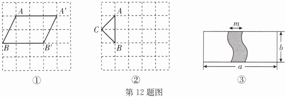 12. (2024·吴中区期末)(1)观察计算:如图①,在$5×5$的网格中,每个小正方形的边长为$1$个单位长度,将线段$AB$向右平移,得到线段$A'B'$,连接$AA',BB'$.①线段$AB$平移的距离是
