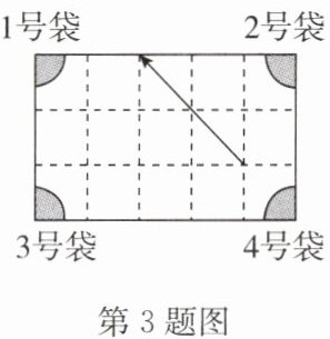 3. (2024·泰兴期中)如图是一个经过改造的规格为 $3×5$ 的台球桌面示意图,图中四个角上的阴影部分分别表示四个人球孔,如果一个球按图中所示的方向被击出(球可以经过台球边缘多次反弹),那么球最后将落入的球袋是 (
