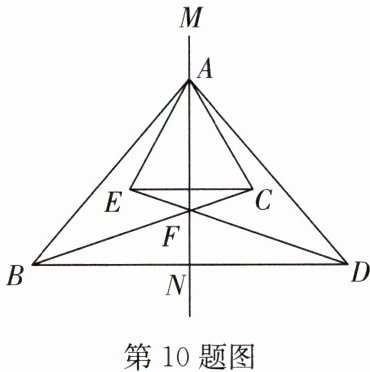10. (12 分)如图,△ABC 和△ADE 关于直线 MN 对称,BC 和 DE 的交点 F 在直线 MN 上。
