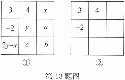 13. 如图①,在$3×3$的方阵图中,填写了一些数和代数式(其中每个代数式都表示一个数),使得每行的$3$个数,每列的$3$个数,斜对角的$3$个数之和均相等。