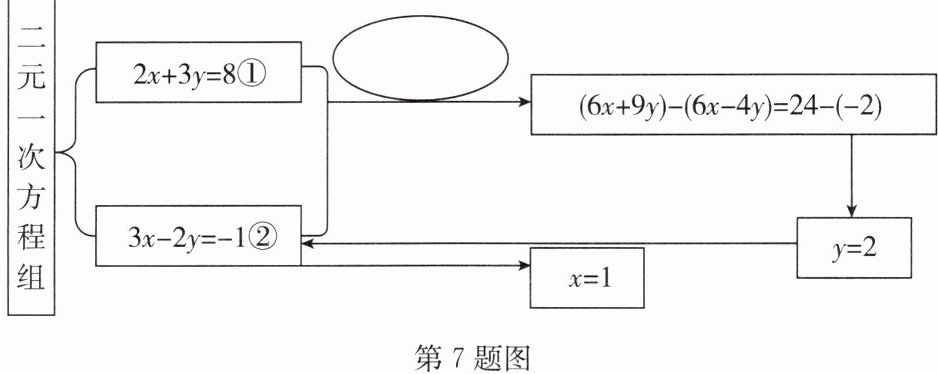 7. (2024·启东期末)解方程组$\begin{cases}2x + 3y = 8,\\3x - 2y = -1\end{cases}$的思路可用如图的框图表示,圈中应填写的对方程①②所做的变形为( )