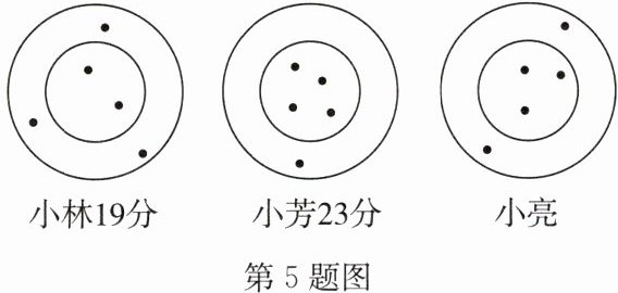 5. (2025·南通一模)小林、小芳和小亮三人玩飞镖游戏,各投 5 支飞镖,规定在同一圆环内得分相同,中靶和得分情况如图,则小亮的得分是