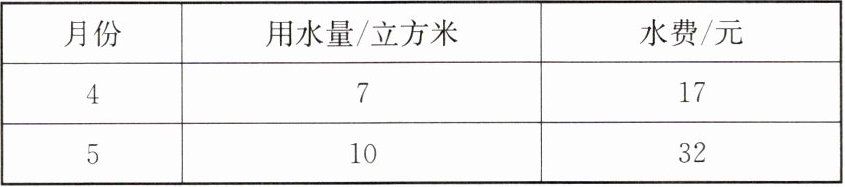 答案:3. 解:设每户居民每月用水不超过 6 立方米时,收费为 x 元/立方米,超过 6 立方米时,超过的部分收费为 y 元/立方米,根据题意,得$\begin{cases}6x + (7 - 6)y = 17, \\ 6x + (10 - 6)y = 32,\end{cases}$解得$\begin{cases}x = 2, \\ y = 5.\end{cases}$