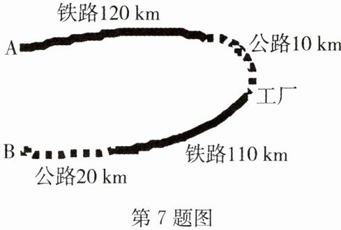 7. (2025·邗江区期中)如图,某化工厂与 $ A $,$ B $ 两地有公路、铁路相连(距离如图所示)。这家工厂从 $ A $ 地购买一批每吨 1000 元的原料运回工厂,制成每吨 8000 元的产品运到 $ B $ 地。已知公路运价为 1.5 元/(吨·千米),铁路运价为 1.2 元/(吨·千米),这两次运输共支出公路运输费 15000 元,铁路运输费 97200 元。