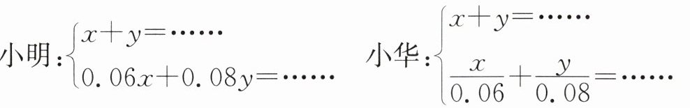 小明:$\begin{cases}x + y = ······\\0.06x + 0.08y = ······\end{cases}$ 小华:$\begin{cases}x + y = ······\frac{x}{0.06}+\frac{y}{0.08}=······\end{cases}$