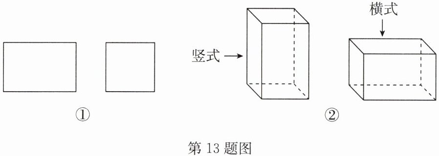 13. (10 分)(2024·秦安县期中)某铁件加工厂用如图①的长方形和正方形铁片(长方形的宽与正方形的边长相等)加工成如图②的竖式与横式两种无盖的长方体铁容器.(加工时接缝材料不计)