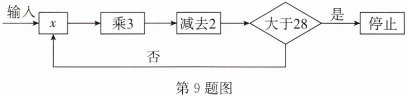 9. (2025·高新区期末)如图,按下面的程序进行运算.规定:程序运行到“判断结果是否大于28”为一次运算.若运算进行了3次才停止,则$x$的取值范围是