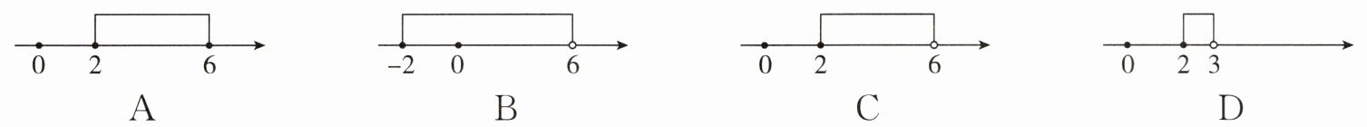 所以不等式组的解集为$2 ≤ x < 6$,在数轴上表示为选项C。