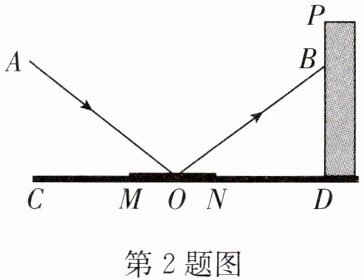 2. 如图,平面镜 $ MN $ 放置在水平地面 $ CD $ 上,墙面 $ PD ⊥ CD $ 于点 $ D $,一束光线 $ AO $ 照射到镜面 $ MN $ 上,反射光线为 $ OB $,点 $ B $ 在 $ PD $ 上,若 $ ∠ AOB = 100° $,则 $ ∠ AOC $ 的度数为(
