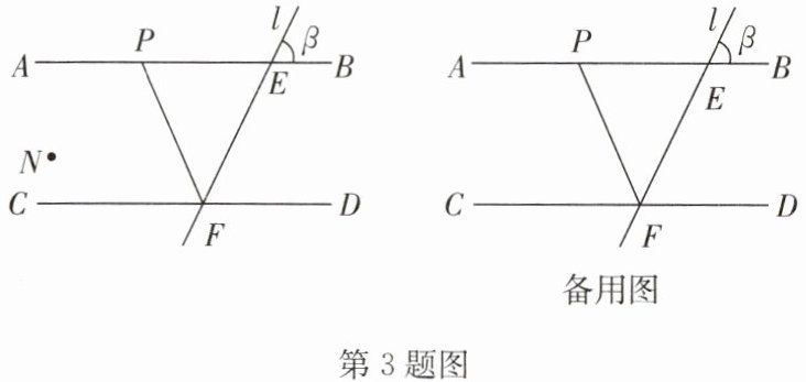 3. 如图,直线$l$分别与直线$AB$,$CD$相交于点$E$,$F$,$AB// CD$,$P$是射线$EA$上的一个动点,点$P$,$E$不重合,连接$PF$.点$N$与点$E$关于直线$PF$对称.