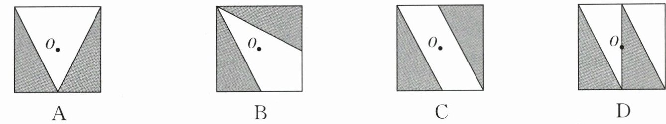2. (2024·广州)下列图案中,点O为正方形的中心,阴影部分的两个三角形能够完全重合,则阴影部分的两个三角形关于点O成中心对称的是(