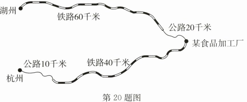 20. (10 分)如图,某食品加工厂与湖州、杭州两地有公路、铁路相连,该食品加工厂从湖州收购一批每吨 2000 元的枇杷运回工厂加工,制成每吨 8000 元的枇杷干运到杭州销售,已知公路运价为 0.8 元/(吨·千米),铁路运价为 0.5 元/(吨·千米),且这次运输共支出公路运输费 960 元,铁路运输费 1900 元.