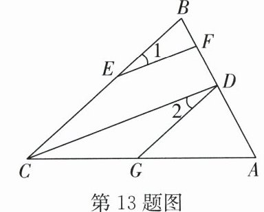 13. (10分)(2024·江阴期中)如图,$CD$为$△ ABC$的角平分线,点$E,F,G$分别在$△ ABC$的边$BC,AB,AC$上,连接$EF,DG$,$EF// CD$,$∠1 = ∠2$,