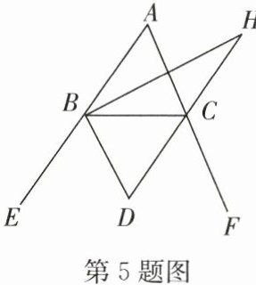 5. (2024·相城区月考)如图,在 $ △ A B C $ 中, $ ∠ A = ∠ A B C $, $ B H $ 是 $ ∠ A B C $ 的平分线, $ B D $ 和 $ C D $ 是 $ △ A B C $ 两个外角的平分线, $ D $, $ C $, $ H $ 三点在一条直线上,下列结论中:① $ D B ⊥ B H $;② $ ∠ D = 90 ^ { \circ } - \frac { 1 } { 2 } ∠ A $;③ $ D H // A B $;④ $ ∠ H = \frac { 1 } { 2 } ∠ A $;⑤ $ ∠ C B D = ∠ D $,其中正确的结论有 (