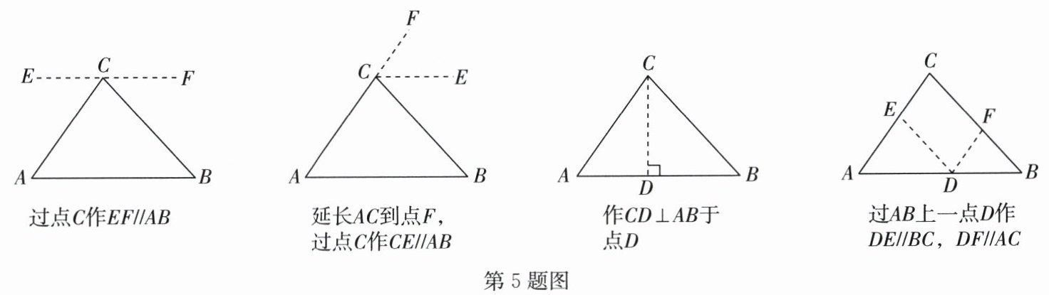 5. (2024·玄武区期中)在探究证明“三角形的内角和是 $ 180^{\circ} $”时,综合实践小组的同学作了如图所示的四种辅助线,其中能证明“$ △ ABC $ 的内角和是 $ 180^{\circ} $”的有 (