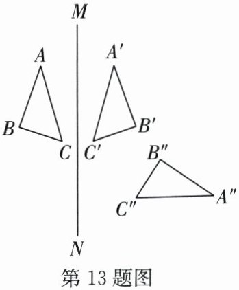 13. (12分)(2024·启东模拟)如图, $ △ ABC $ 和 $ △ A'B'C' $ 关于直线 $ MN $ 对称, $ △ A'B'C' $ 和 $ △ A''B''C'' $ 关于直线 $ EF $ 对称.