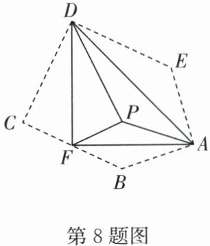 8. 如图,将五边形纸片 $ABCDE$ 分别沿 $AF$,$DF$,$AD$ 折叠后,顶点 $B$,$C$,$E$ 恰好都落在纸片内的点 $P$ 处,若 $∠ CDE$ 是锐角,则在下列判断中,正确的是(