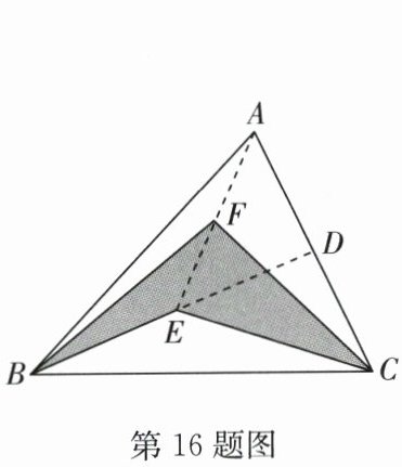 16. 如图,$BD$ 是 $△ ABC$ 的边 $AC$ 上的中线,$AE$ 是 $△ ABD$ 的边 $BD$ 上的中线,$BF$ 是 $△ ABE$ 的边 $AE$ 上的中线,连接 $CE$,$CF$. 若 $△ ABC$ 的面积是 $16$,则阴影部分的面积是