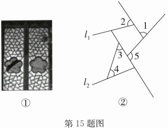 15. 冰裂纹是苏州园林花窗的一种装饰纹样,看似杂乱,实则有序,象征着冰消雪融,春回大地. 图①是冰裂纹梅花窗,图②是该花窗中的部分图案. 已知 $l_1 // l_2$,$∠ 1 = ∠ 2 = 70^{\circ}$,$∠ 3 = ∠ 4 = 50^{\circ}$,则 $∠ 5 =\_\_\_\_\_\_^{\circ}$.