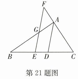 21. (6 分)如图,$AD$ 平分 $∠ BAC$,点 $E$ 在 $BC$ 上,点 $F$ 在 $CA$ 的延长线上,$EF$ 交 $AB$ 于点 $G$,且 $∠ AGF = ∠ F$. 求证:$EF // AD$.