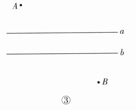 (3)为切实保障居民用气安全,某地开展天然气设施改造工程. 如图③所示,某小区(点 $A$)和天然气站(点 $B$)分别位于公路两侧,若公路的宽度是一定的(公路的两边 $a // b$),现要在地下通一条天然气管道接通 $A$,$B$ 两地,管道通过公路时,为了尽量少破坏马路,管道通过公路的部分与公路的一边 $a$ 互相垂直,求作管道的位置,使得从点 $A$ 到点 $B$ 的管道长度最短.(如有必要可写出文字说明,不写说明不扣分)
