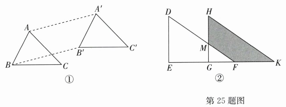 (2)如图②,将 $△ DEF$ 沿 $EF$ 方向向右平移得到 $△ HGK$,已知 $∠ E = 90^{\circ}$,若 $FK = 6cm$,$MG = 3cm$,$MH = 4cm$,求四边形 $MHKF$ 的面积;