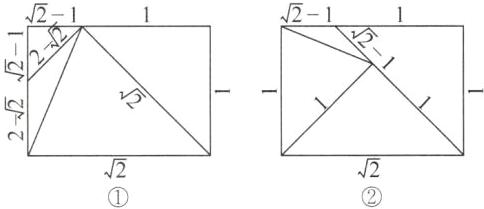 几何直观 俊俊和霞霞合做将一张长为$\sqrt{2}$、宽为$1$的矩形纸片进行裁剪(共裁剪三次),裁剪出来的图形刚好是$4$个等腰三角形(纸张无剩余).霞霞说:“有一个等腰三角形的腰长是$1$.”俊俊说:“有一个等腰三角形的腰长是$\sqrt{2}-1$.”那么另外两个等腰三角形的腰长可能是