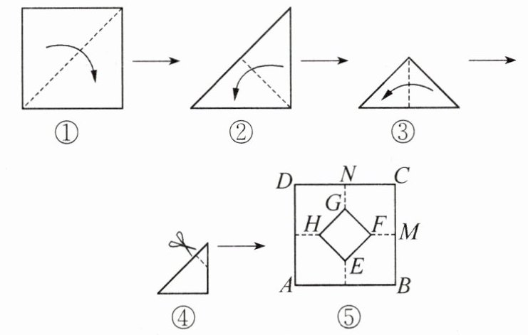 14. 将一张正方形纸片按如图所示步骤,通过折叠得到图④,再沿虚线剪去一个角,展开铺平后得到图⑤,其中 $ FM $,$ GN $ 是折痕.若正方形 $ EFGH $ 与五边形 $ MCNGF $ 的面积相等,则 $ \dfrac{FM}{GF} $ 的值是(