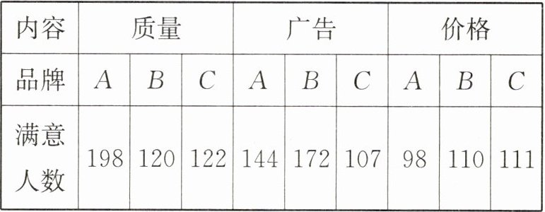(3) 有影响. 理由如下:B,C 两种品牌洗衣粉在质量和价格方面的满意人数比较接近,而在广告方面的满意人数相差较大,且 B 品牌洗衣粉的市场占有率明显高于 C 品牌洗衣粉,所以广告对客户选择品牌有影响.