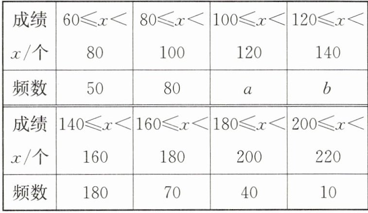 (2)由(1)及题表,得a = 120,成绩在140≤x<160的有180人,则补全频数分布直方图如图: