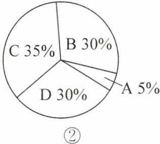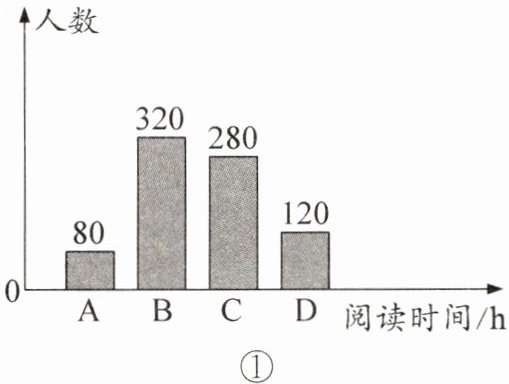 开放探究(2024·江苏盐城)阅读涵养心灵. 某地区 2023 年 9 月就“初中生每天阅读时间”对七年级 8 000 名学生进行了抽样调查(设每天阅读时间为 $ t \ \mathrm{h} $,调查问卷设置了四个时间选项:A. $ t < 1 $;B. $ 1 \leq t < 1.5 $;C. $ 1.5 \leq t < 2 $;D. $ t \geq 2 $),并根据调查结果绘制成如图①所示的条形统计图. 2023 年 9 月该地区出台系列激励措施,力推学生阅读习惯养成. 为了检测这些措施的效果,2023 年 12 月该地区又对七年级学生进行了一次抽样调查,并根据调查结果绘制了如图②所示的扇形统计图.