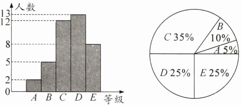 3. 某中学七年级甲、乙两班参加了一次数学考试,每班的考试人数都为 40,每班的考试成绩都分为 $ A $,$ B $,$ C $,$ D $,$ E $ 五个等级,两个班本次数学考试成绩的统计图如图所示,根据统计图提供的信息,可知两个班人数相等的等级是