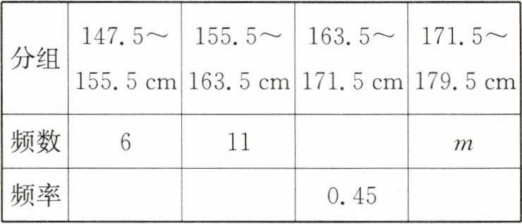 1. 为了解某地八年级男生的身高情况,从中随机抽取 40 名八年级男生的身高进行统计,并绘制出如下的统计表,则 $ m $ 的值为(