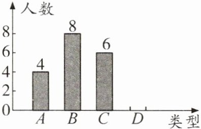 2. 某校 300 名学生参加植树活动,要求每人植树 2~5 棵,活动结束后从中随机抽查了 20 名学生每人的植树棵数,并分为四类:$ A $ 类 2 棵、$ B $ 类 3 棵、$ C $ 类 4 棵、$ D $ 类 5 棵,将各类的人数绘制成如图所示的条形统计图(不完整),则这 20 名学生中 $ D $ 类学生有