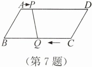 7. (2024·四川自贡)如图,在$□ ABCD$中,$\angle B = 60^{\circ}$,$AB = 6\mathrm{cm}$,$BC = 12\mathrm{cm}$,点$P$从点$A$出发,以$1\mathrm{cm}/\mathrm{s}$的速度沿$A\to D$运动,同时点$Q$从点$C$出发,以$3\mathrm{cm}/\mathrm{s}$的速度沿$C\to B\to C\to···$往复运动,当点$P$到达点$D$时,点$Q$随之停止运动。在此运动过程中,线段$PQ = CD$出现的次数是(