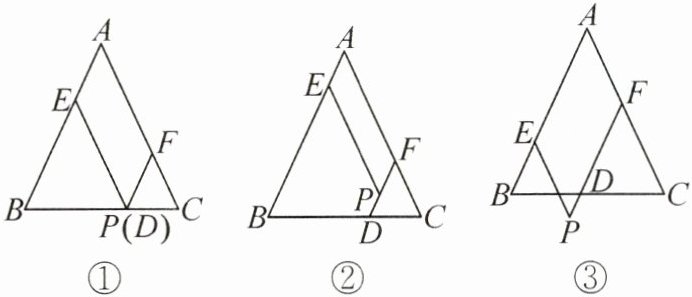 综合实践 已知在$\triangle ABC$中,$AB = AC$,$P$为$\triangle ABC$所在平面内一点,过点$P$分别作$PE// AC$交$AB$于点$E$,$PF// AB$交$BC$于点$D$,交$AC$于点$F$。