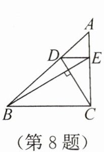 8. 如图,在$\triangle ABC$中,$DE// BC$,分别交$AB$,$AC$于$D$,$E$两点,且$CD⊥ BE$,$CD = 3$,$BE = 5$,则$BC + DE$的值为