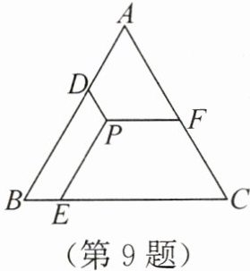 9. 如图,等边三角形$ABC$是一块周长为 12 的草坪,$P$是草坪内的任意一点,过点$P$有三条小路$PD$,$PE$,$PF$,且满足$PD// AC$,$PE// AB$,$PF// BC$,则这三条小路的总长为