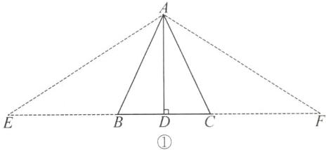 答案:10.(1)如图①,延长DB至点E,使BE = AB,延长DC至点F,使CF = AC,连接AE,AF。因为AB + BD = AC + CD,所以DE = DF。又AD⊥BC,所以AD垂直平分EF,即AE = AF。所以△AEF是等腰三角形,即∠E = ∠F。因为AB = BE,所以∠E = ∠BAE。又∠ABC = ∠E + ∠BAE,所以∠ABC = 2∠E。同理,得∠ACB = 2∠F。所以∠ABC = ∠ACB。所以AB = AC。