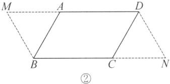 (2)如图②,在DA的延长线上取点M,使AM = AB,在BC的延长线上取点N,使CN = CD,连接BM,DN,则∠M = ∠ABM,∠N = ∠CDN。因为AB + AD = CD + CB,所以AM + AD = CN + CB,即DM = BN。又AD//BC,所以四边形MBND是平行四边形,即MB = ND,∠M = ∠N。所以∠ABM = ∠CDN。所以△ABM≌△CDN(ASA)。所以AM = CN。所以DM - AM = BN - CN,即AD = BC。所以四边形ABCD是平行四边形。